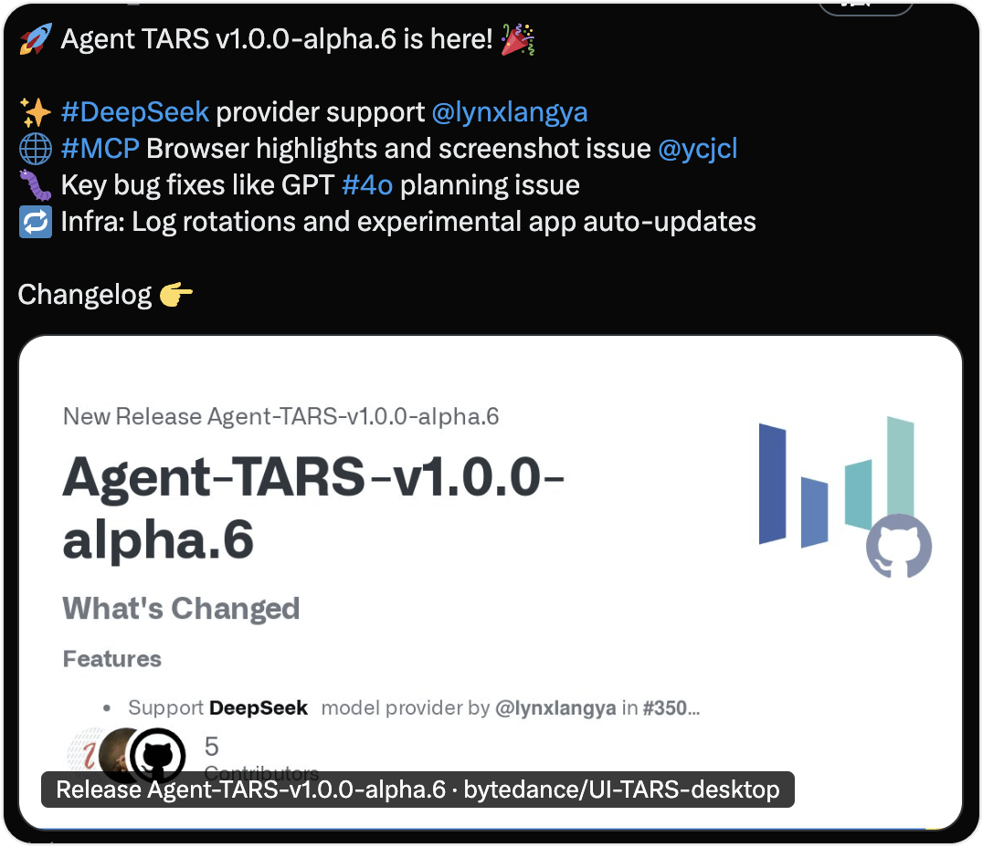 In March, we open-sourced an early technical preview of Agent TARS. Agent TARS's tagline is "an open-source multimodal AI agent offering seamless integration with various real-world tools". After its release, it received some support from the community and gained a certain influence.